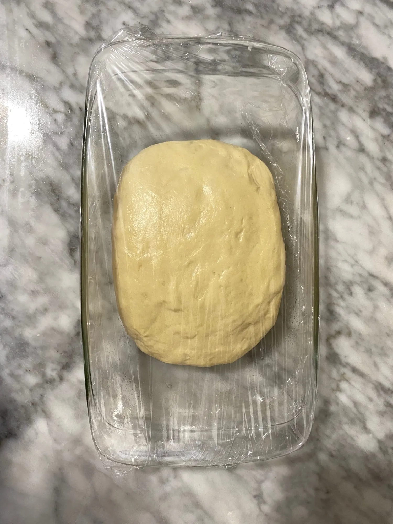 Grease a loaf pan. Place your dough inside it. Roll to grease the dough. Cover and let it rise until doubled in size (about 1 and a half hours).