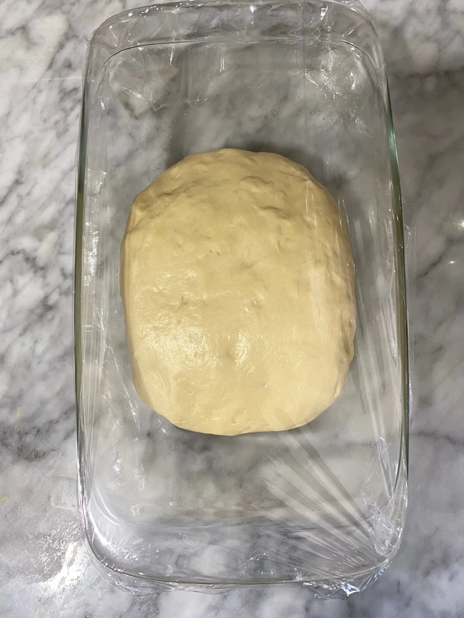 Grease a bowl and roll the dough around in it. Cover the bowl and let it sit in a warm space for about an hour.